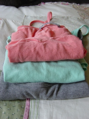So the best part.... folding! I love folding my clothes into neat little stacks. As I pull out the loads... blue was first yesterday, my folding table fills up with a wash of color- blues, then greys, then came the reds and pinks. You can see the progression of colors in the stacks. Each laundry day is different. I like the random color combinations that pop up. It gives me good ideas for new projects and I just fall in love with my clothes all over again. Here's an awesome color combo that happened randomly yesterday...