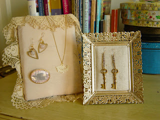 As the craft fair approaches, I've been thinking up ways to display my jewelry. I didn't want to spend much $$$ on fancy displays so here's what I came up with: