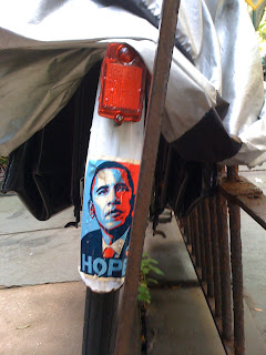 I've been taking for granted the fact that I pretty much live in a triple pro-Obama town, have quadruple-pro-Obama pals and practically see his face on every surface from fenders to fanny packs. (ok I didn't see a fanny pack, but how cool would that be?)